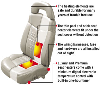 Seat heaters can be installed in almost any vehicle. Seat covers are easily removed and the heating elements are adhered to the seat base foam.